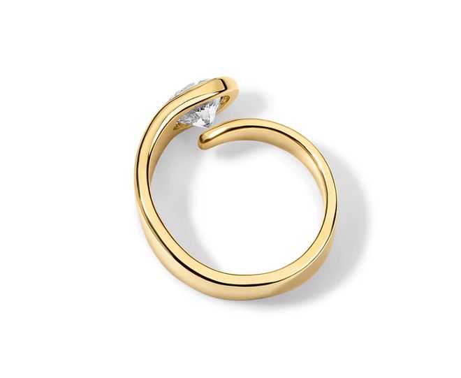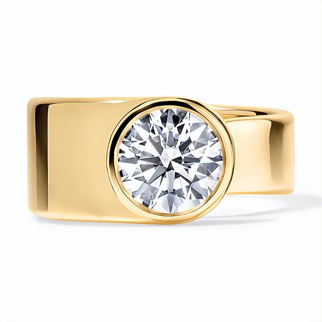 黄金戒托巧妙的缠绕于手指之上,一枚2克拉钻石镶嵌在戒指的正中,虽然克拉数不大,但钻石的亭部完美呈现在人们的面前,引导人们的视觉不自觉的向内延伸,仿佛要探寻其中隐藏的无尽奥秘。